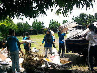 Ada hal lucu disela-sela kegiatan bersih-bersih ini. Saat tumpukan bekas setting gabus sudah menggunung, kami bingung untuk membuangnya. Pertama kami bertanya pada bu Harno, kira-kira dimana TPA di dekat sekolah. Tapi karna terlalu banyak yang harus dibuang, dan sepertinya tidak bisa bila dibawa hanya dengan motor, Bu Harno memberi saran untuk membakar gabus-gabus tersebut di lapangan. Awalnya kami sedikit miris mengingat semua setting itu dibuat dengan kerja keras kita semua, tapi karna tak ada cara lain akhirnya kami mencoba membakarnya. Dan saat api mulai menyala inilah yang terjadi: